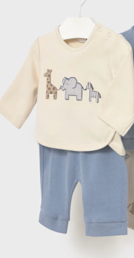 Long sleeved Sweatshirt for newborn baby. Round neckline. Snap button fastening on the shoulder to allow the garment to be put on easily. Decorative elements: decorative applique, embroidery.