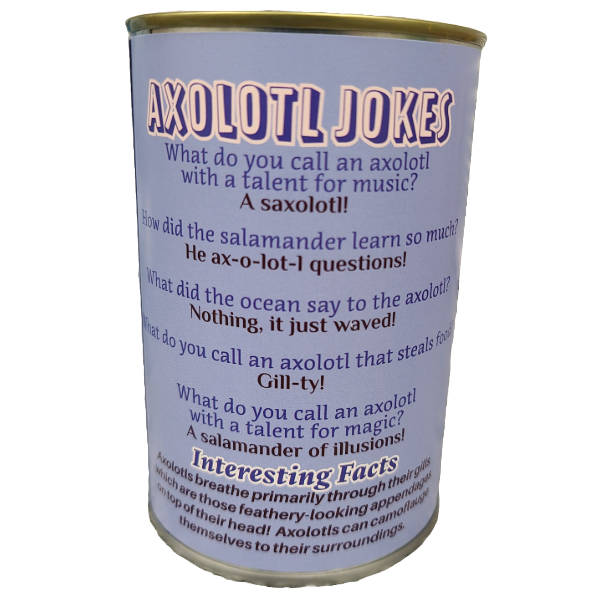 About this can: Meet Noodle the Canned Blue Axolotl! Included is 1 plush blue axolotl sealed in a can. Plush measures approx. 5 inches Funny axolotl jokes and interesting facts on the can Designed and canned in the USA. Label made in USA. Plush made in China. 100% recyclable packaging Our cans are loved by all, children and adults alike.