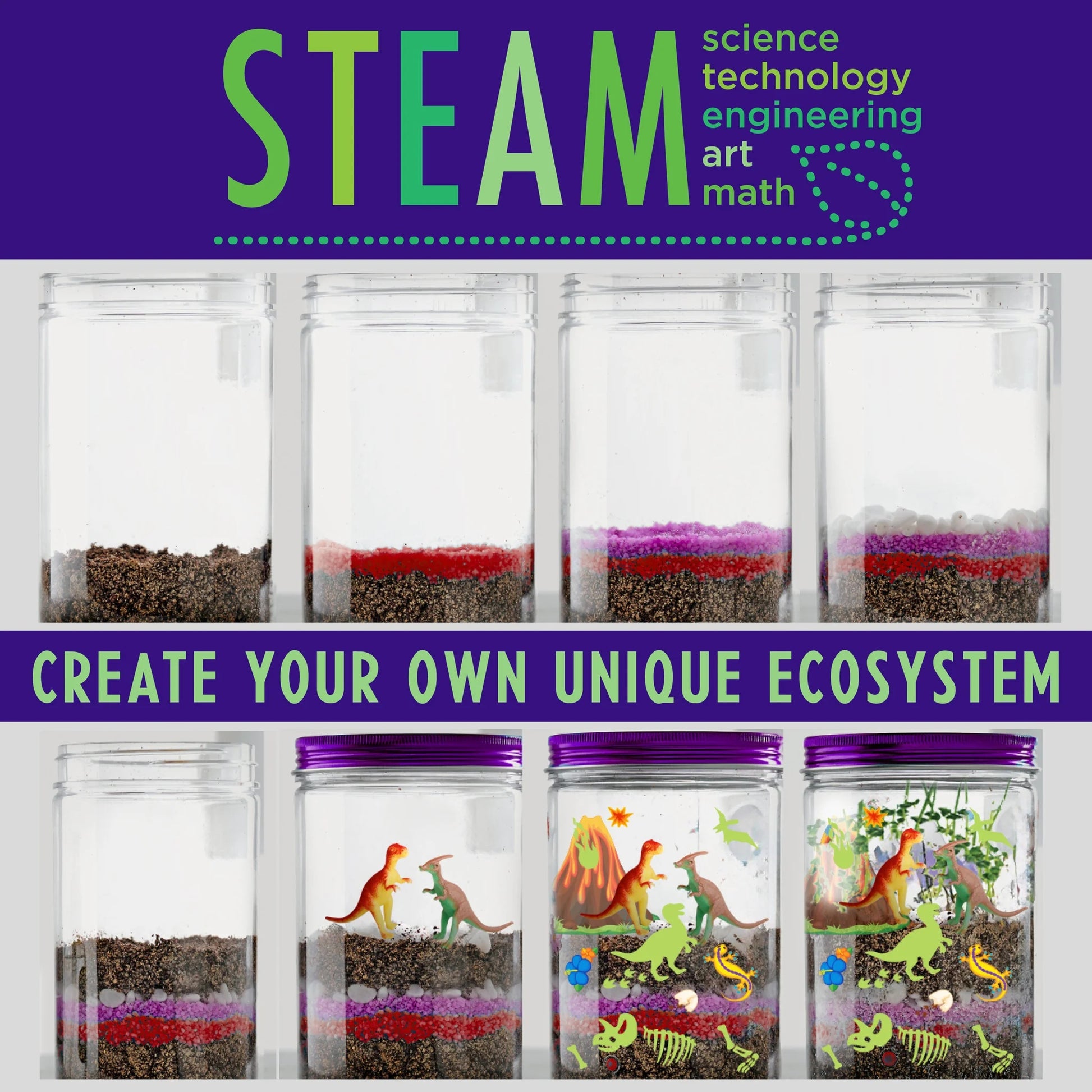 Contents Include: 1 Plastic mason jar terrarium with starry sky lid, 1 Bag of potting mix, I Bag of chia seeds, 1 Bag of wheat grass seeds, T-Rex and Stegosaur figurines, 2 Colors of decorative sand, I Bag of stones, 1 Colorful sticker sheet, 1 Glow in the dark sticker sheet, 1 Plant mister and Instructions