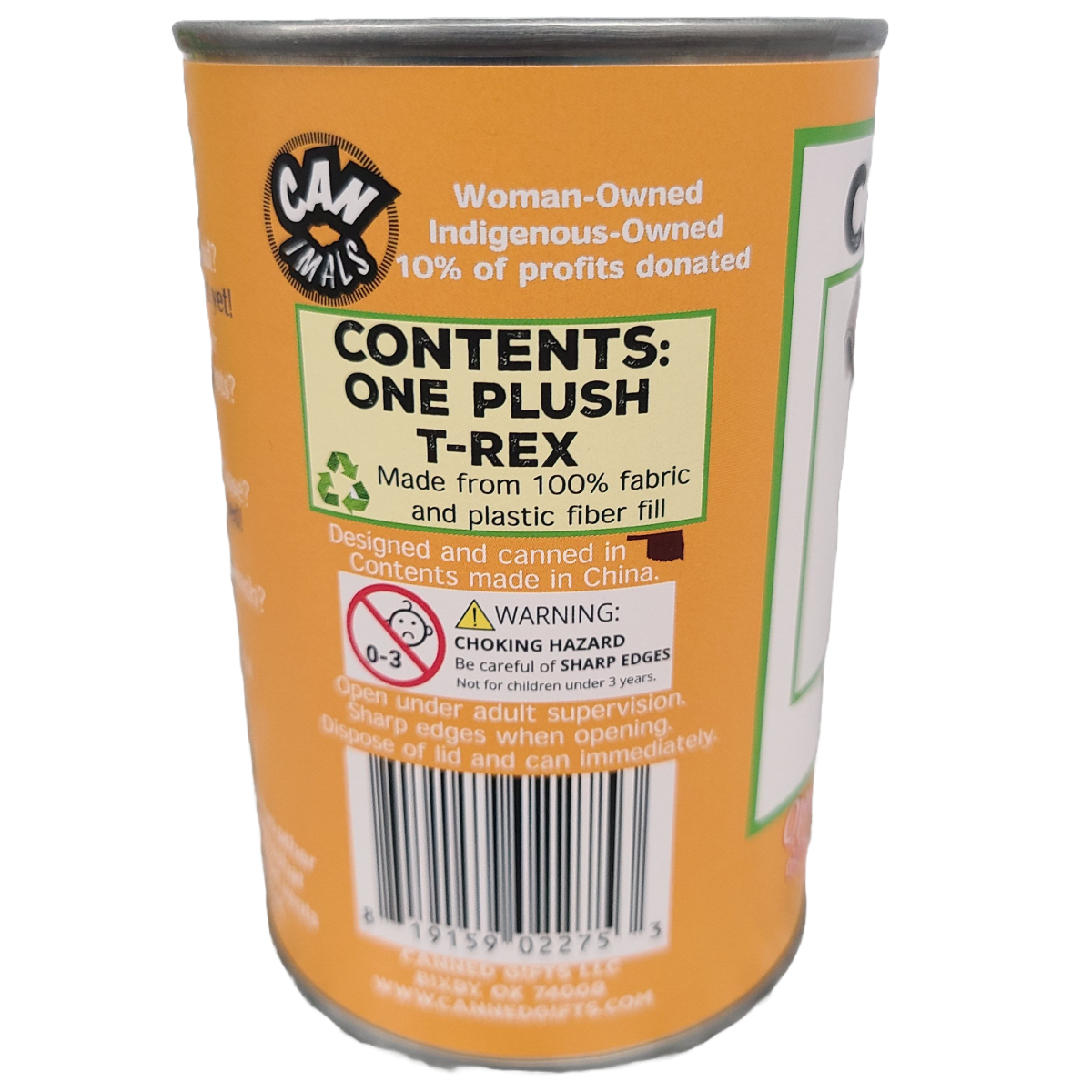 Meet Rumble the Canned T-Rex! These are super fun and popular with gift shops and novelty and boutique shops! • T-Rex dinosaur plush sealed in a soup can. Plush measures approx. 5 inches each. • Funny T-Rex jokes and an interesting fact on the can. Designed and canned in the USA. Can and label made in USA. Plush made in China. Few people can say they've received a Canned T-Rex before!